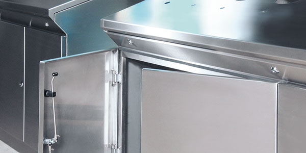 Edelstahlschränke und Steuerpulte produzieren wir standardmäßig in zwei oder viertüriger Ausführung.